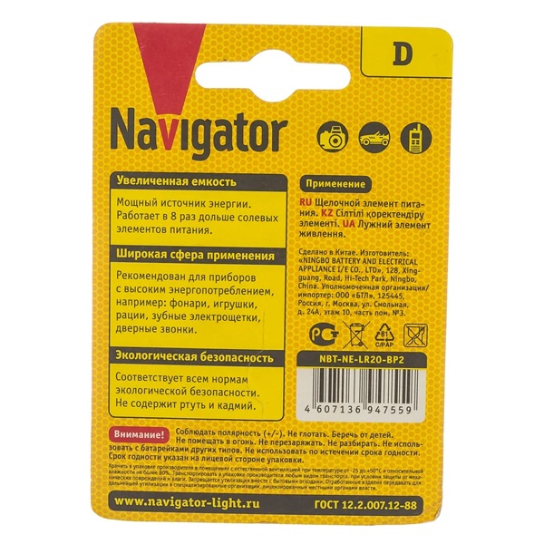 • Батарейка D Navigator LR20 1.5V NBT-NE-LR20-BP2 (упаковка 2 шт)