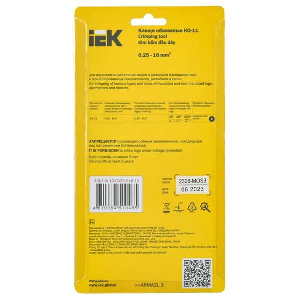 Клещи обжимные ARMA2L 3 с квадратным профилем обжима, для опрессовки втулочных наконечников НШВ, НШВИ и НШВИ2 0,25-16мм2 A2L3-KL10-C025-016-11