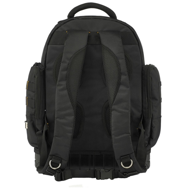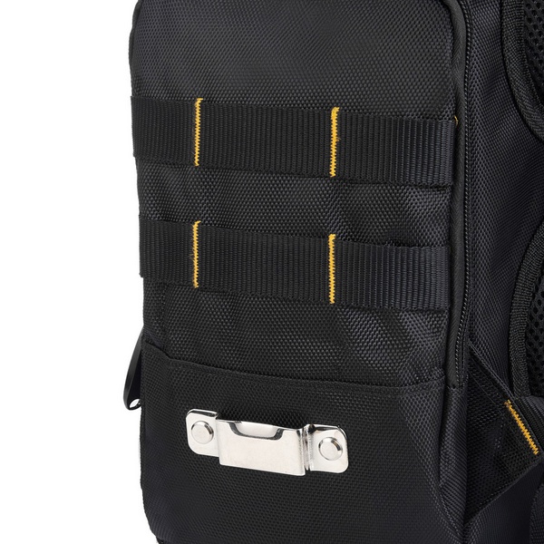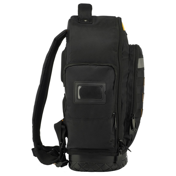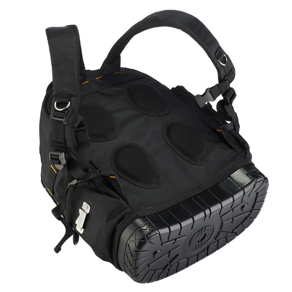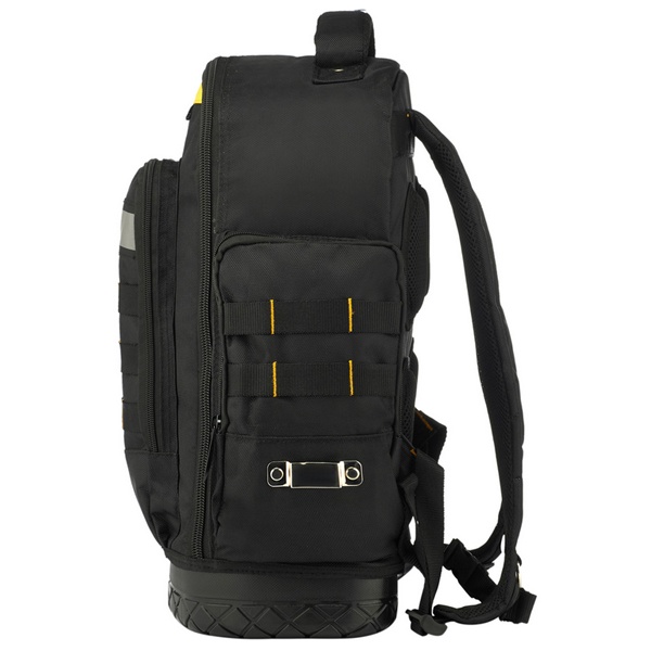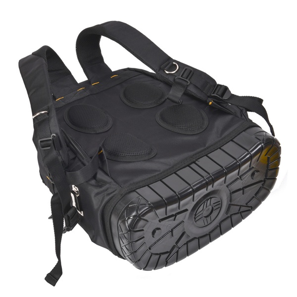 Изготовлен из прочной износостойкой ткани полиэстер 1680D Оксфорд с PVC-пропиткой, устойчивой к влаге, загрязнениям и механическим повреждениям.Подкладка из полиэстера 600D Оксфорд обеспечивает дополнительную прочность и долговечность внутренней части рюкзака.Усиленное прорезиненное дно с высокими бортиками защищает содержимое от влаги и грязи при установке на влажные или пыльные поверхности.Светоотражающий элемент повышает безопасность при работе в тёмное время суток или в условиях плохой видимости.Анатомическая ручка, усиленная заклёпками, обеспечивает удобную переноску даже при значительном весе.Широкие анатомические плечевые лямки с нагрудным ремнём равномерно распределяют нагрузку и снижают давление на спину.Мягкая спинка с анатомическими вставками поддерживает правильную посадку и повышает комфорт при длительном ношении.Крепление для рулетки упрощает доступ к часто используемому инструменту.Организация внутреннего пространства: