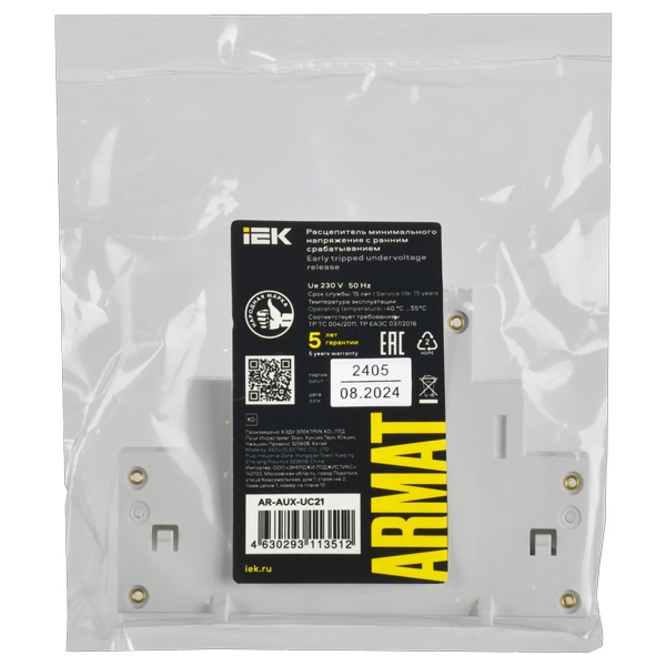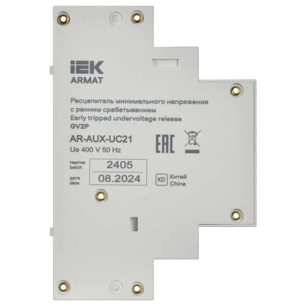 Расцепитель минимального напряжения для автоматических выключателей защиты двигателя серии ARMAT предназначен для отключения выключателя при критическом снижении напряжения в сети. Устройство соответствует требованиям ТР ТС 004/2011 и ТР ЕАЭС 037/2016. Обеспечивается безвинтовое крепление к автоматическим выключателям защиты двигателя типа GV2P серии ARMAT.