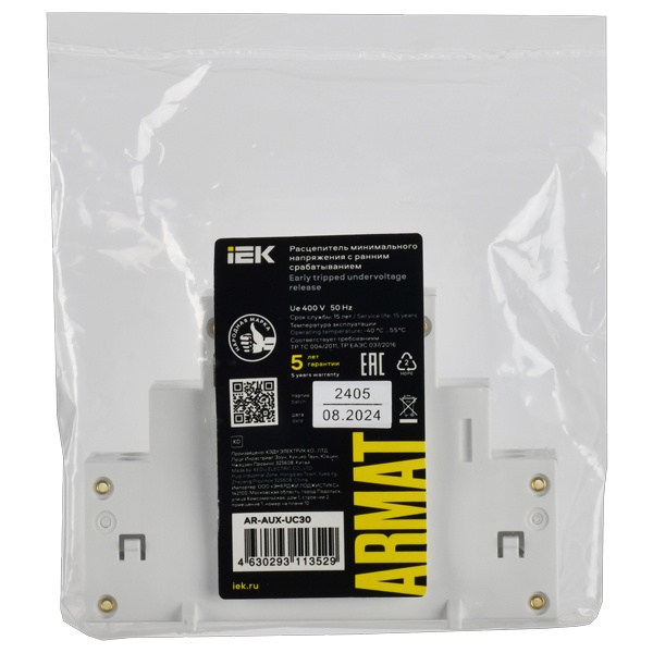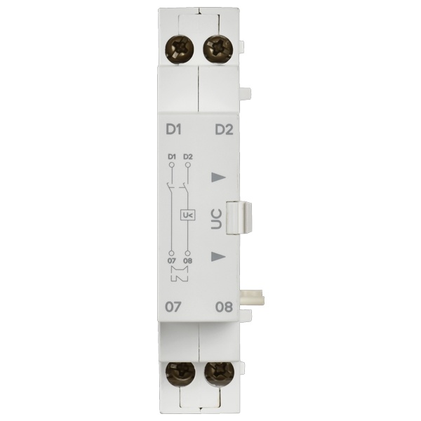 Расцепитель минимального напряжения для автоматических выключателей защиты двигателя серии ARMAT предназначен для отключения выключателя при критическом снижении напряжения в сети. Устройство соответствует требованиям ТР ТС 004/2011 и ТР ЕАЭС 037/2016. Обеспечивается безвинтовое крепление к автоматическим выключателям защиты двигателя типа GV2P серии ARMAT.