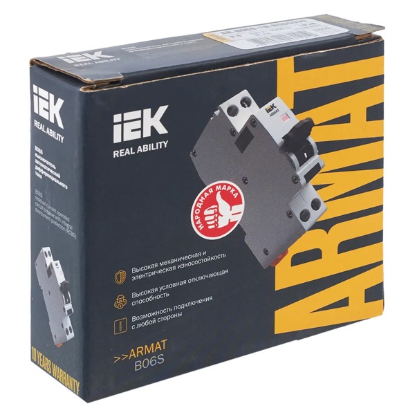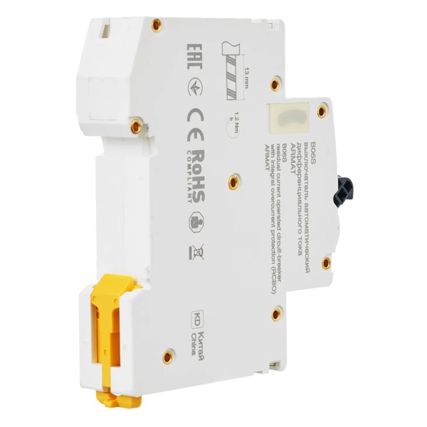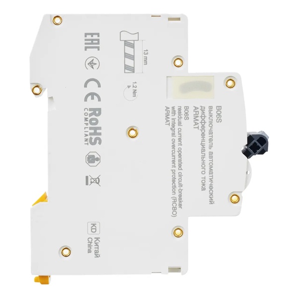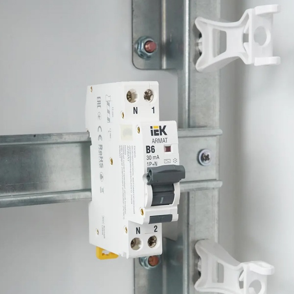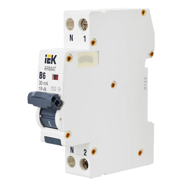 Дифференциальный автомат типа B06S серии АRMAT от производителя ИЭК представляет собой дифференциальный прибор со встроенной защитой от сверхтоков, который используется в однофазных электросетях переменного тока с частотой 50 Герц и напряжением до 230 Вольт. При обнаружении устройством дифференциального тока выше номинального значения, происходит отключение защищаемой цепи. А также с его помощью обеспечивается автоматическое отключение электроустановки при возникновении короткого замыкания или перегрузки. АВДТ защищает человека от поражения током в случае прямого прикосновения, или косвенного контакта человека с доступными частями электроустановок, находящимися под напряжением в следствии нарушении изоляции. Он относится к категории АС. Это означает что автомат реагирует только на утечки синусоидального тока. Данная модель рассчитана на номинальную нагрузку тока 6 Ампер при допустимом значении отключающего дифференциального тока 30 милиампер. Она обладает высокой предельной коммутационной способностью 6000 Ампер с характеристикой срабатывания от сверхтоков типа В. Устройство имеет компактный размер шириной 1 модуль, 2 полюса: 1N+P, рукоятку управления и тестовую кнопку для плановой проверки работоспособности. Областью применения являются распределительные щиты общественных, коммерческих и жилых зданий. Быстрый монтаж и демонтаж устройства производится на DIN-рейку.
