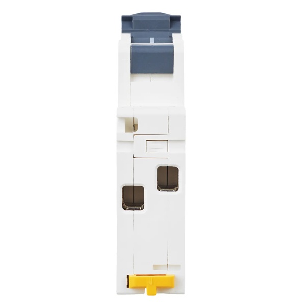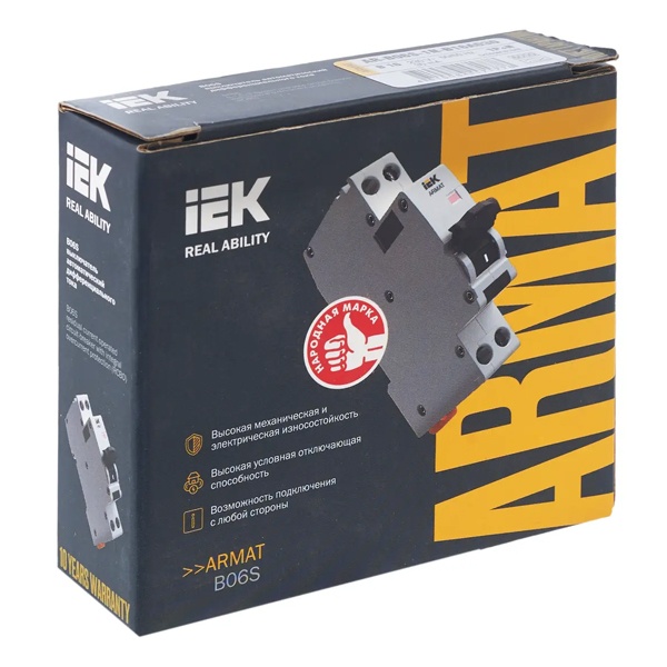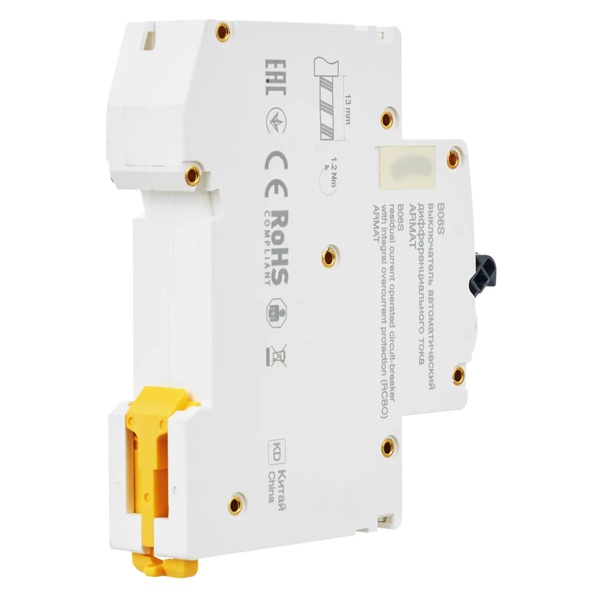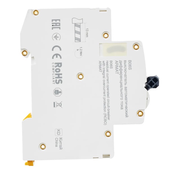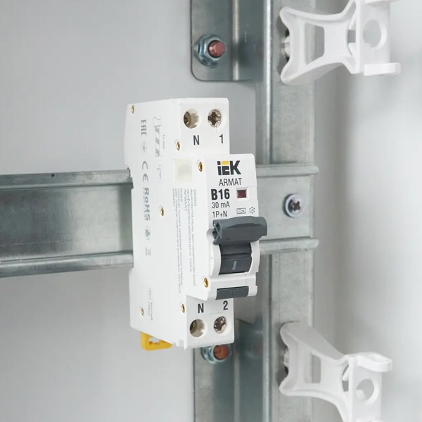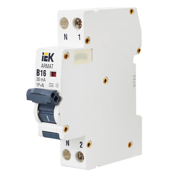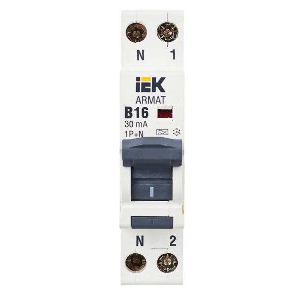 Дифавтомат серии АРМАТ от известного производителя IEK представляет собой одномодульный прибор со встроенной защитой от сверхтоков, предназначенный для работы в однофазных сетях с целью защиты человека от поражения электрическим током при повреждении изоляции электроустановок. Данная модель рассчитана на допустимое значение токовой нагрузки 16 Ампер при напряжении сети 230 Вольт переменного тока и частоте 50 Герц. В случае если значение отключающего дифференциального тока превысит 30 милиампер, устройство разомкнет защищаемую цепь. Характеристика срабатывания от сверхтоков относится к типу В. А сам агрегат типа А реагирует на утечки переменного синусоидального и пульсирующего постоянного тока. Предельное значение отключающей способности прибора составляет 6000 Ампер. Дифавтоматы крепятся на DIN-рейку в распределительных щитках. Они эксплуатируются в промышленности, на объектах розничной торговли, гаражах и частном жилом секторе. Он имеет 2 полюса, 1 из которых надежно защищен, рукоятку управления с двумя положениями: I/О (вкл/откл), а также тестовую кнопку для периодической проверки работоспособности устройства. Достоинством аппарата выступает прочная конструкция, коммутационный ресурс до 10 тысяч циклов, возможность подключения нагрузки сверху и снизу.