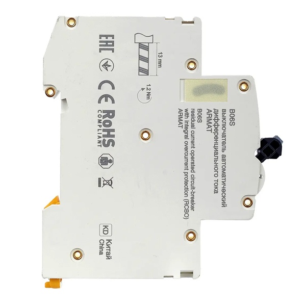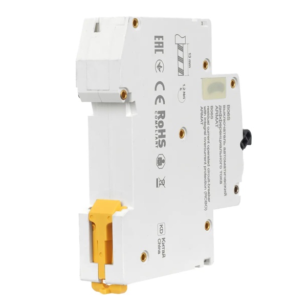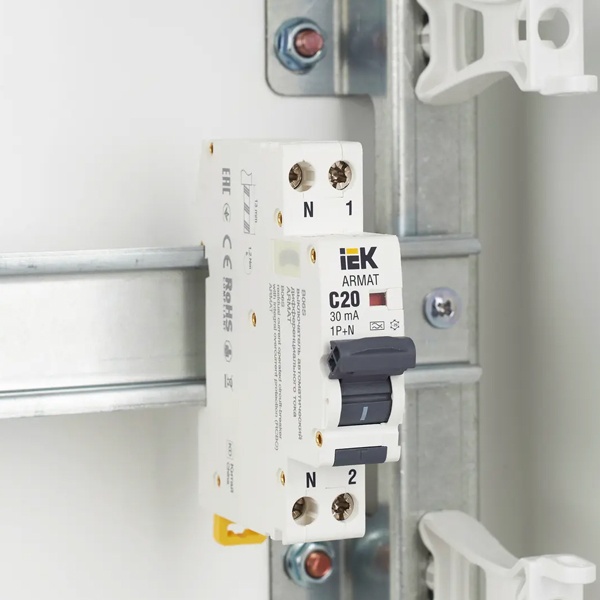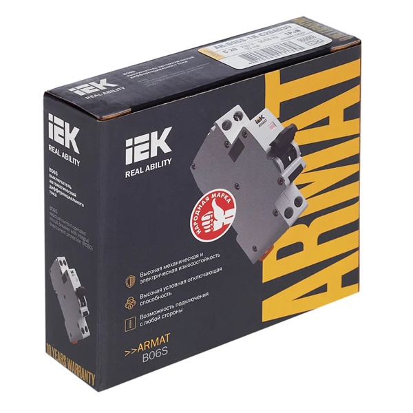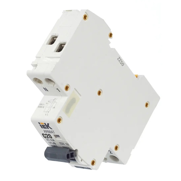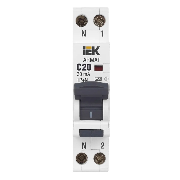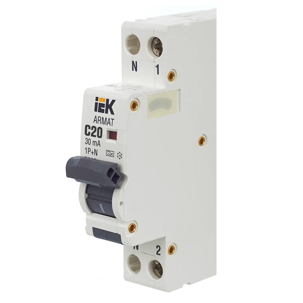 Дифференциальный автомат класса А серии АРМАТ производства IEK представляет собой компактное устройство со встроенной защитой от сверхтоков. Оно применимо в однофазных электросетях переменного тока с частотой 50 Герц и напряжением до 230 Вольт. АВДТ выполняет функцию обнаружения дифференциального тока, сравнивает его со значением тока срабатывания и отключает защищаемую цепь, если дифференциальный ток превышает это значение. Также с помощью данного агрегата осуществляется автоотключение установки при возникновении КЗ и перегрузок. Дифавтомат защищает человека от поражения током и оборудование от пожара вследствие воздействия на них токов утечки. Данная модель рассчитана на номинальную нагрузку тока 20 Ампер при допустимом значении тока утечки – 30 милиампер. Она обладает высокой коммутационной способностью 6000 Ампер и характеризуется уставкой типа C. АВДТ реагирует как на чистый синусоидальный переменный ток утечки так и импульсный постоянный. Он обладает шириной 1 модуль, имеет 2 полюса: 1P+N и монтируется на дин-рейку. Агрегат оснащен удобным рычагом управления с индикацией срабатывания по току утечки, тока короткого замыкания и в случае перегрузки. Кнопка «Тест» позволяет следить за работоспособностью устройства. Срок службы достигает 15 лет.
