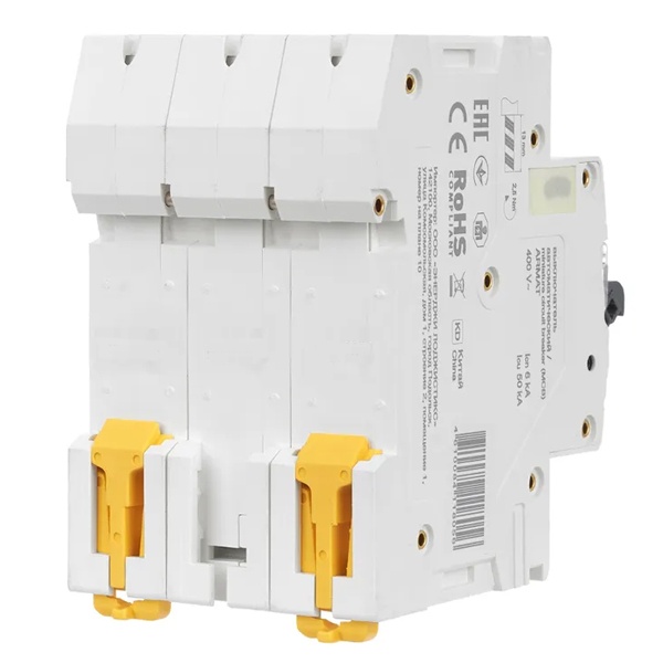 Линейка автоматических выключателей АРМАТ от производителя IEK представляет модель устройства модульного типа M10N. Компактный автомат шириной 3 модуля коммутирует и защищает электроустановки низкого напряжения, чем обеспечивает их бесперебойную работу. Его функция состоит в автоматическом отключении цепей при возникновении сверхтоков: короткого замыкания или перегрузок. Он крепится на din-рейку с помощью защелок и монтируется в распределительные щиты многоквартирных и частных домов, торговых объектов и мест общественного назначения. Автомат проводит ток в нормальном режиме и отключает нагрузку в случае возникновения аварийной ситуации. Он имеет 3 полюса и рассчитан на номинальную токовую нагрузку до 32 Ампер. Его отключающая способность составляет 10 килоампер при допустимом рабочем напряжении сети 400 Вольт переменного тока. Аппарат относится к устройствам с характеристикой срабатывания С и применяется для защиты стандартной цепи, в которую подключены приборы освещения, бытовая техника. Он обладает долгим сроком службы и является надежным агрегатом. Монолитная лицевая панель повышает безопасность использования. Спереди имеется рычаг ручного управления с поперечной планкой в 2 положениях: I/O (включено/отключено), а также окно состояния контактов и площадка для маркировки с прозрачной крышкой. Параметры: 54х85х70 мм.
