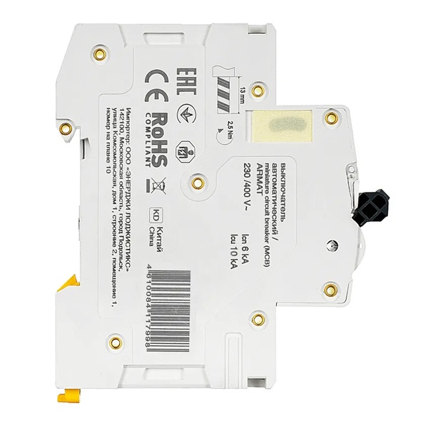 Компактный автоматический выключатель M10N относится к серии модульных устройств Armat от известного производителя IEK. Это надежная линейка агрегатов с высокой скоростью срабатывания и долгим сроком службы. Предназначение автомата состоит в управлении нагрузкой, разъединении электрических цепей и их защите от перегрузки и короткого замыкания. Его цель – обеспечение бесперебойной работы оборудования, находящегося под постоянным напряжением с защитой от перегрева. Аппарат применяется в распределительных щитах многоквартирных или частных домов, а также в админзданиях и на объектах промышленности. Крепится на монтажную DIN-рейку с помощью защелок. Подвод питания производится с любой стороны. Корпус сделан из качественного полиамида. Прибор имеет 3 защищенных полюса и эргономичный двухпозиционный рычаг с поперечной планкой с положениями: I/O (включено/отключено). Монолитная лицевая панель обеспечивает безопасность пользователя. Наличие окошка состояния контактов позволяет наблюдать за их положением. Автомат рассчитан на номинальную токовую нагрузку 40 Ампер и работает в сети напряжением 400 Вольт переменного тока. Его отключающая возможность составляет 10 килоампер, а характеристика срабатывания соответствует типу С, которая предполагает применение для защиты цепей, к которым подключены розетки, приборы освещения. Механическая износостойкость составляет 20 000 циклов, коммутационная – 10 000 циклов. Параметры автомата: 54х85х70 мм.