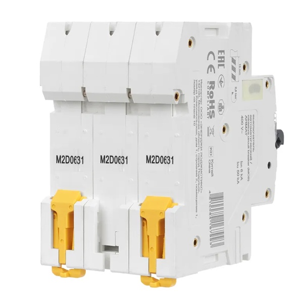 Модульный автоматический выключатель M10N серии АРМАТ от компании IEK предназначен для управления нагрузкой, разъединения электрических цепей и их защиты от перегрузки и короткого замыкания. Прибор с тремя полюсами работает в сети переменного тока с напряжением 400 Вольт. Отключающая способность составляет 10 килоампер, что гарантирует долговечный срок службы и надежность агрегата. Номинальный ток с защитной характеристикой D не должен превышать 4 Ампер. Данное устройство можно встретить в распределительных щитах жилых домов, административных зданий и объектах промышленности. Уставка типа D подходит для защиты линий, к которым подключены электродвигатели или трансформаторы. Подключение автомата допустимо с любой стороны. Присутствует окошко для дополнительных устройств, которое закрыто защитной пластиковой заглушкой, предотвращая попадание пыли. Корпус выполнен из качественного полиамида. С лицевой стороны есть эргономичный рычаг управления с двумя положениями: I/O, также имеется окошко состояния контактов. При необходимости маркировки предусмотрена площадка с прозрачной крышкой. Установка производится на стандартную дин-рейку путем защелкивания с двумя фиксированными положениями. Механическая износостойкость составляет 20 000 циклов, коммутационная – 10 000 циклов. Аппарат данной серии обладает высокой скоростью срабатывания и 3 классом токоограничения. Параметры автомата: 54х85х70 мм.