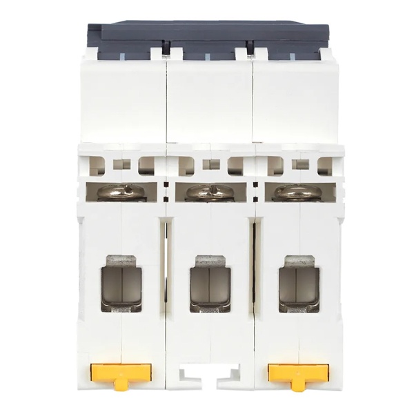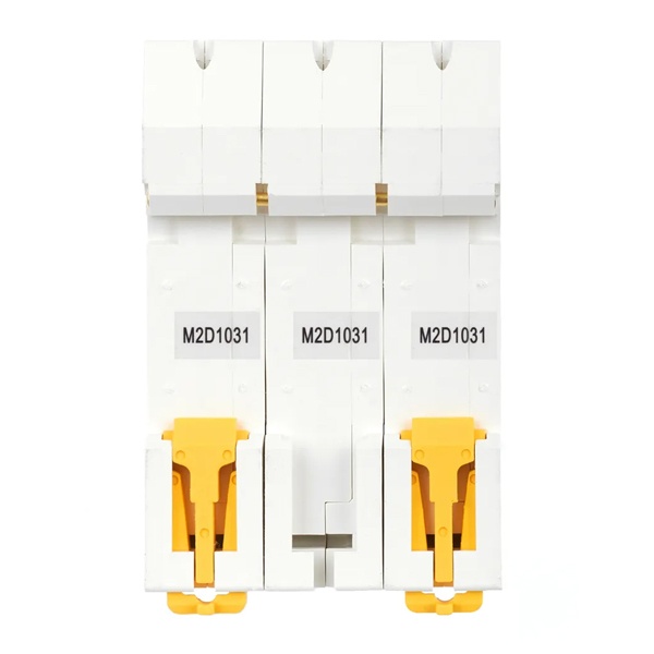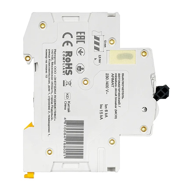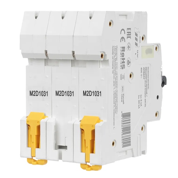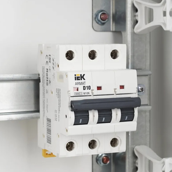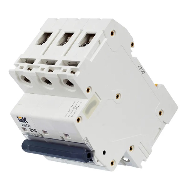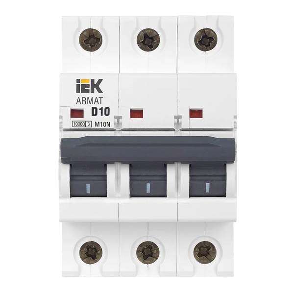 Линейка автоматических выключателей АРМАТ от производителя IEK представляет модель устройства модульного типа M10N. Компактный автомат с шириной 3 модуля крепится на din-рейку с помощью защелок и монтируется в распределительные щиты многоквартирных и частных домов, торговых объектов и мест общественного назначения. Его функция состоит в автоматическом отключении цепей при возникновении сверхтоков: короткого замыкания или перегрузок. Выключатель коммутирует и защищает электроустановки низкого напряжения, чем обеспечивает их бесперебойную работу. Он проводит ток в нормальном режиме и отключает нагрузку в случае возникновения аварийной ситуации. Аппарат имеет 3 полюса и рассчитан на номинальную токовую нагрузку до 10 Ампер. Его отключающая способность составляет 10 килоампер при допустимом рабочем напряжении сети 400 Вольт переменного тока. Аппарат относится к устройствам с характеристикой срабатывания D и применяется для защиты цепи, в которую подключены трансформаторы, электромоторы и т.п. Он обладает долгим сроком службы и является надежным агрегатом. Сплошная лицевая панель повышает безопасность использования. Присутствует рычаг ручного управления с поперечной планкой в 2 положениях: I/O (включено/отключено), а также окно состояния контактов и площадка для маркировки с прозрачной крышкой. Параметры: 54х85х70 мм.