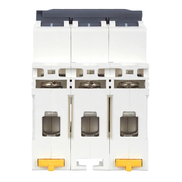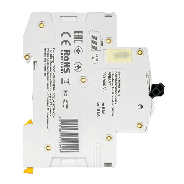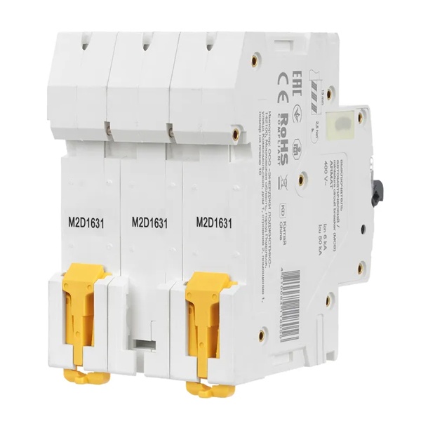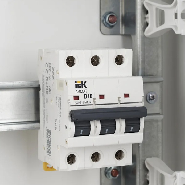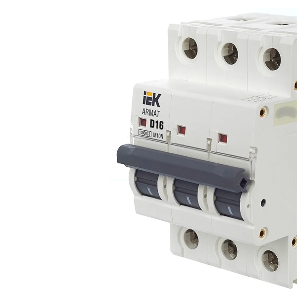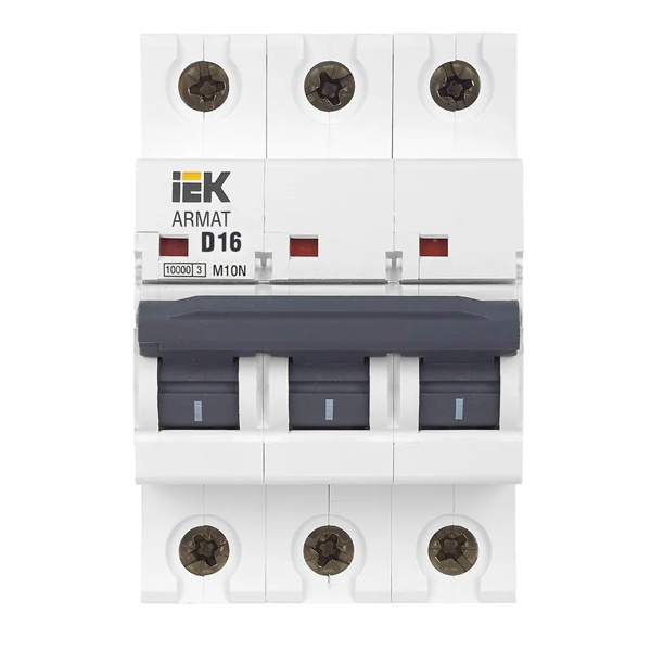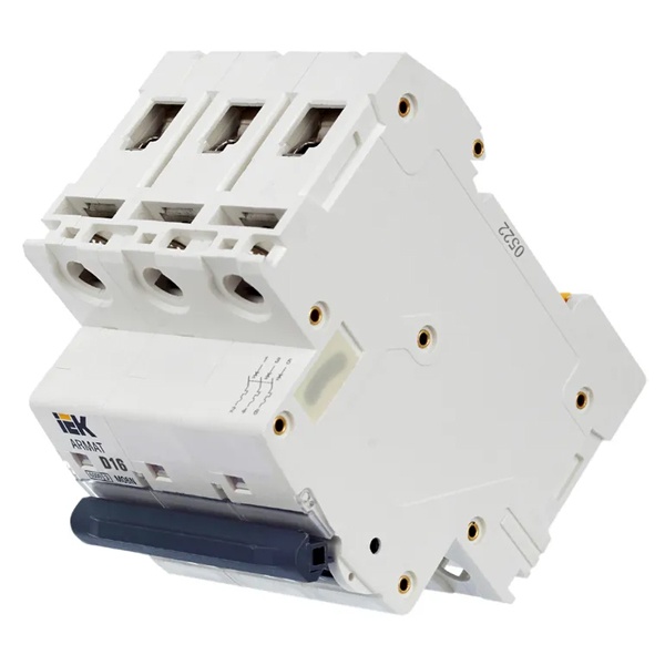 Компания IEK представляет линейку модульного оборудования Armat, к которой относятся автоматы серии M10N с характеристикой срабатывания D. Данная модель представляет собой компактный автоматический выключатель шириной 3 модуля = 54 мм. Его можно встретить в распределительных щитах многоквартирных домов, промышленных объектов и коммерческих зданий. Основная функция выключателя состоит в автоматическом отключении цепей при возникновении сверхтоков: короткого замыкания или токов перегрузки. Соответственно, он обеспечивает защиту электросетей от возможного перегрева. Токоограничивающее устройство с уставкой типа D имеет 3 полюса и рассчитано на напряжение сети переменного тока 400 Вольт. Номинальный ток составляет 16 Ампер. Автомат используется либо на вводе, либо для защиты цепей с большой пусковой токовой нагрузкой (электродвигатели или трансформаторы). Отключающая возможность составляет 10 килоампер. Это сила тока КЗ, при которой оборудование может многократно отключаться, не выходя из строя. Данный показатель свидетельствует о надежности аппарата и гарантирует его долгий срок службы. Механическая износостойкость составляет 20 тысяч циклов, коммутационная – 10 тысяч циклов. Внешне автомат заключен в корпус из качественного полиамида. На лицевой стороне присутствует удобный рычаг управления и окошко состояния контактов. Подключение дополнительных устройств закрыто пластиковыми заглушками, предотвращая попадание пыли. Подвод питания производится с любой стороны. Габаритные параметры автомата: 54х85х70 мм.