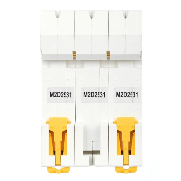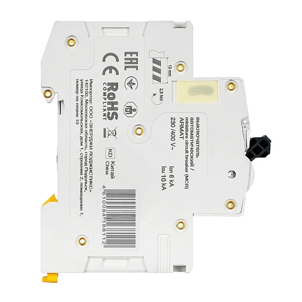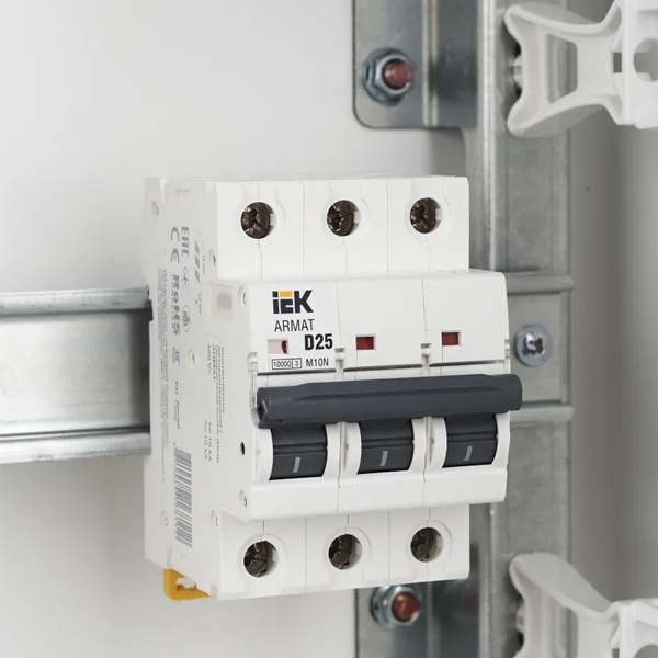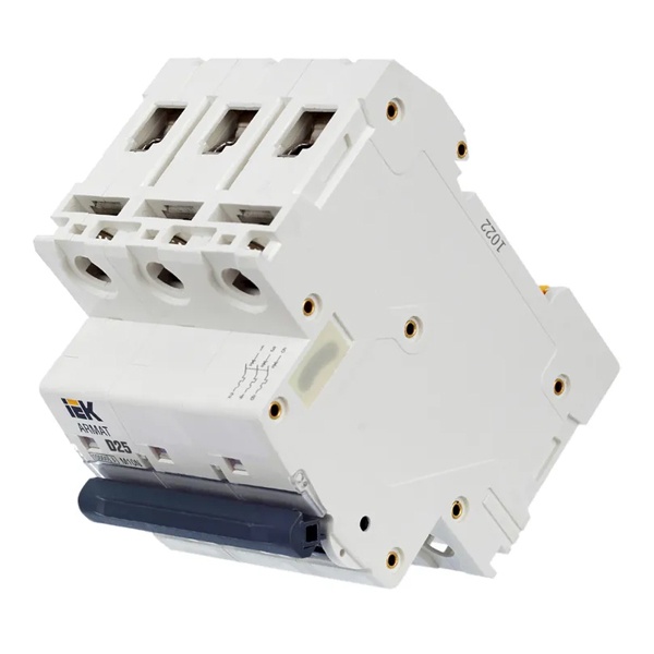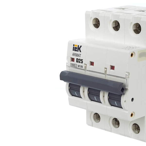 Компактный автоматический выключатель M10N относится к серии модульных устройств Armat от известного производителя IEK. Это надежная линейка агрегатов с высокой скоростью срабатывания и долгим сроком службы. Предназначение автомата состоит в управлении нагрузкой, разъединении электрических цепей и их защите от перегрузки и короткого замыкания. Его цель – обеспечение бесперебойной работы оборудования, находящегося под постоянным напряжением с защитой от перегрева. Аппарат применяется в распределительных щитах многоквартирных или частных домов, а также в админзданиях и на объектах промышленности. Крепится на монтажную DIN-рейку с помощью защелок. Подвод питания производится с любой стороны. Корпус сделан из качественного полиамида. Прибор имеет 3 защищенных полюса и эргономичный двухпозиционный рычаг с поперечной планкой с положениями: I/O (включено/отключено). Монолитная лицевая панель обеспечивает безопасность пользователя. Наличие окошка состояния контактов позволяет наблюдать за их положением. Автомат рассчитан на номинальную токовую нагрузку 25 Ампер и работает в сети напряжением 400 Вольт переменного тока. Его отключающая возможность составляет 10 килоампер, а характеристика срабатывания соответствует типу D, которая предполагает использование в качестве вводного для повышения шансов селективности с нижестоящими групповыми автоматами при КЗ. Автомат следует применять только в обоснованных случаях при больших пусковых токах нагрузок: при подключении мотора или трансформатора. Механическая износостойкость составляет 20 000 циклов, коммутационная – 10 000 циклов. Параметры автомата: 54х85х70 мм.