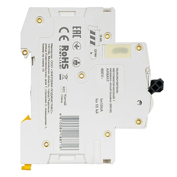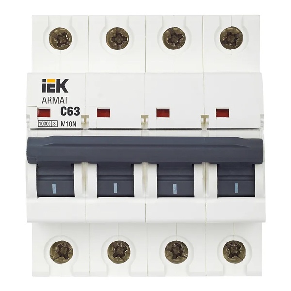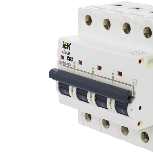 Автомат модульного типа M10N производства известной компании IEK серии ARMAT предназначен для управления нагрузкой и защиты электрических цепей от сверхтоков: перегрузки и короткого замыкания. Принцип его действия состоит в мгновенном разъединении цепей при возникновении аварийных ситуаций. Поэтому он обеспечивает бесперебойную работу оборудования, находящегося под постоянной нагрузкой. Устройство обладает уставкой типа С, поэтому рекомендовано для защиты стандартных линий, к которым подключены розетки, приборы освещения и бытовая техника. Характеризуется отключающей возможностью в 10 килоампер и работает в сети переменного тока с напряжением 400 Вольт. Рассчитан на номинальную нагрузку тока 63 Ампера. Гарантирует надежную работу, высокую скорость срабатывания и долгий срок службы. Прибор можно встретить в распределительных щитах многоквартирных или частных домов, а также в промышленных зданиях и местах общественного назначения. Он оснащен 4 полюсами и крепится на монтажной DIN-рейке. Подключение допустимо с любой стороны. Место подключения дополнительных устройств защищено пластиковой крышкой. Панель прибора оборудована двухпозиционным рычагом с поперечной планкой с положениями: I/O (включено/отключено), имеет окошко состояния контактов и поле для маркировки с прозрачной крышкой. Корпус изготовлен из качественного пластика. Механическая износостойкость составляет 20 000 циклов, коммутационная – 10 000 циклов. Параметры автомата: 72х85х70 мм.