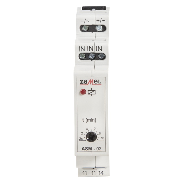 Лестничный таймер ASМ-02 предназначено для управления освещением в коридорах или лестничных клетках. После отключения системы это реле включает освещение на время, установленное пользователем, после чего происходит автоматическое отключение. Время работы может плавно регулироваться в диапазоне от 2 сек до 10 минут с помощью потенциометра, находящегося на торцовой панели реле. Реле обладает функцией антиблокировки. Лестничный таймер ASM-02 можно использовать также в качестве реле времени, реализующего функцию выключения с задержкой.