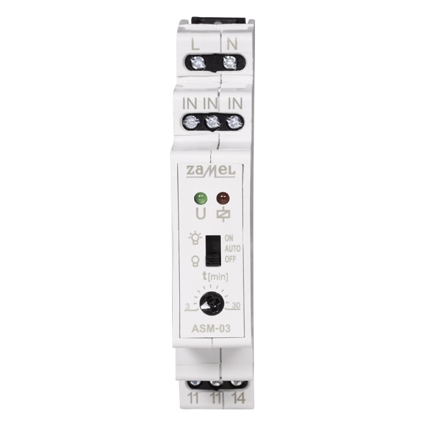 Лестничный таймер ASМ-03 предназначено для управления освещением в коридорах или на лестничных клетках. После отключения системы это реле включает освещение на время, установленное пользователем, после чего происходит автоматическое отключение. Время работы может плавно регулироваться в диапазоне от 3 до 30 минут с помощью потенциометра, находящегося на торцовой панели реле. Автомат оснащен антиблокировочной функцией, a также функцией постоянного включения ON и постоянного выключения OFF.