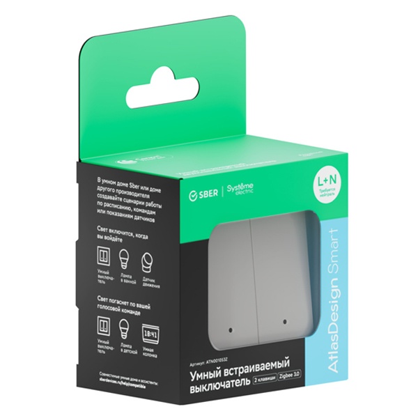 Умный выключатель Sber в элегантном белом исполнении входит в серию умных электроустановочных изделий AtlasDesign Smart. Он совместим с рамками и устройствами Systeme Electric из коллекций AtlasDesign: Classic, Nature, Art и Antique, что позволяет гармонично вписать его в любой интерьер. Индикатор на корпусе настраивается по цвету и яркости или может быть полностью отключён в зависимости от ваших предпочтений.