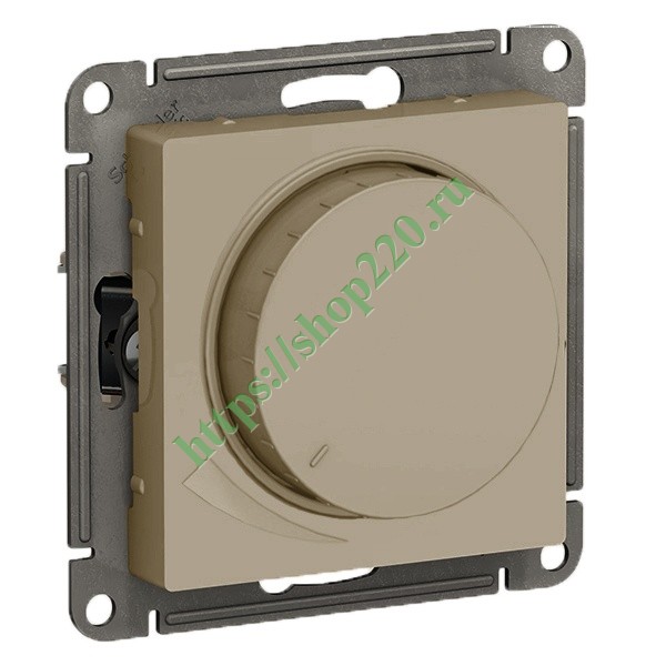 Представленный электрический механизм совмещает функции выключателя и регулятора интенсивности светового потока. Изделие входит в серийную линейку изделий Атлас Дизайн и предназначено для управления осветительным оборудованием с предельной нагрузкой 315 Ватт.Поворотная ручка, она же – кнопка, расположена на лицевой съемной панели. Все части декоративной накладки выполнены из термопласта с улучшенной формулой, повышающей прочность пластиката и устойчивость к химическим и лучевым (ультрафиолет) атмосферным воздействиям. Цвет – шампань.Все токопроводящие элементы диммирующего устройства изготовлены из медно-никелевого сплава, поддерживающего высокий уровень электрических характеристик. Сетевые вводы надежно фиксируются в винтовых зажимах.Особенности конструкции светорегулятора предусматривают встроенную установку в монолитные и каркасные объемы рабочих поверхностей. Постовой монтаж производится в подрозетник на опорные лапки регулируемого винтового механизма. Для уровневой корректировки внешней части предусмотрена суппортная перфорация.