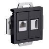 Коммуникационные розетки, входящие в серийную линейку Атлас дизайн, способствуют максимальной организации бытовых и офисных помещений. Компьютерная розетка освобождает пространство от лишних проводов, мешающих свободному передвижению.Предлагаемое изделие представляет собой телекоммуникационное разъемное устройство малого тока, оснащенное популярным разъемом – «Джек» RJ45 кат 5Е. Конфигурация гнезда коннекторного подключения (под углом 45 градусов) сочетает удобство и надежность.Лицевая панель розетки выполнена из унифицированного полимера:- прочного;- устойчивого к агрессивным воздействиям окружающей среды;- обладающего антибактериальными свойствами. Цветовое оформление, имитирует карбон, который уже несколько лет находится в тренде у стилевых дизайнеров.Все контактные группы изготовлены из сплавов, легированных серебром и цветными металлами, что значительно увеличивает электрическую проводимость материала. Винтовые зажимы обеспечивают надежность и плотность подключений ввода.Монтаж розетки – скрытый, с установкой в подрозетник на лапки винтового разжимного механизма. Перфорация суппорта позволяет откорректировать уровневое положение внешней части устройства, винтовым креплением на рабочую поверхность.