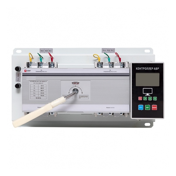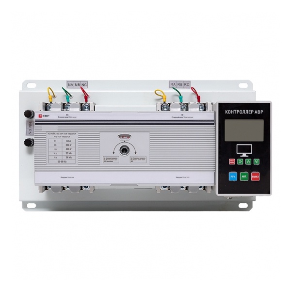 Данная модель устройства АВР серии ТСМ от известного производителя EKF представляет собой моноблок, который обеспечивает резервное электроснабжение нагрузки в случае пропадания напряжения на основной линии. Ввод резерва происходит автоматически, а функция защиты предотвращает от токов перегрузки и коротких замыканий. Устройство имеет 3 полюса и рассчитано на токовую нагрузку до 63 Ампер при номинальном значении напряжения сети 400 Вольт. Максимальная отключающая способность составляет 35 кАмпер, а механическая износостойкость достигает 6000 циклов. Управление прибором АВР осуществляется с помощью интеллектуального контроллера, который может быть настроен на несколько программ переключения с ручным и дистанционным управлением. Устройство состоит из контактного блока, блока управления и 2-х силовых автоматов в литом корпусе. Степень защиты IP30 предполагает его размещение в сухом месте, защищенном от влаги. Сфера применения такого прибора достаточно обширна и включает в себя потребителей обязательного резервирования нагрузки: больницы, транспортную инфраструктуру, тепловые станции, противопожарные системы, объекты министерства обороны, а также желательного использования: административные здания, объекты жилого и коммерческого назначения.