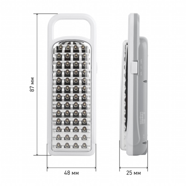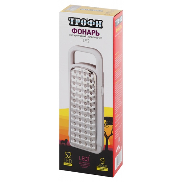 Трофи TL52 - кемпинговый фонарь-светильник с 52 белыми светодиодами, двумя режимами работы, интересным дизайном и удобной ручкой для переноски. Корпус из ударопрочного пластика. Работает без подзарядки 6 активных часов. Практически весь корпус фонаря стал пространством для эргономичного размещения ярких и одновременно экономичных светодиодов. 52 LED-элемента, расположенных в четыре продолговатых ряда, обеспечивают высочайший световой поток - 380 лм. Это качественный заливающий ближний свет. Светодиоды не перегорают, не тускнеют и не нуждаются в замене. А корпус из ударопрочного пластика защищает устройство от появления механических повреждений в результате падений или ударов. Трофи ТL52 прослужит максимально долго. Он заряжается от стандартной электросети 220 В и после подзарядки работает непрерывно в течение 6 полных часов. Фонарь имеет устойчивую конструкцию, что позволяет с удобством использовать его и как переносной походной светильник. Доступны два режима работы - 100%-яркость и эконом-режим