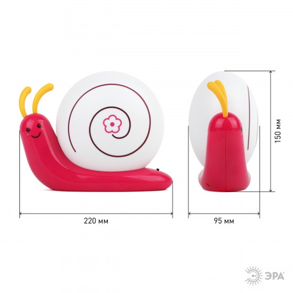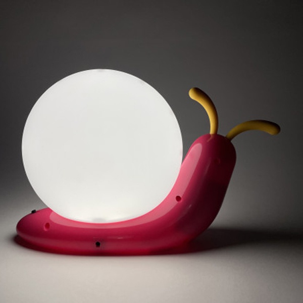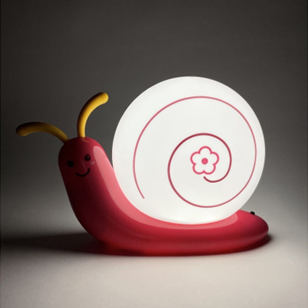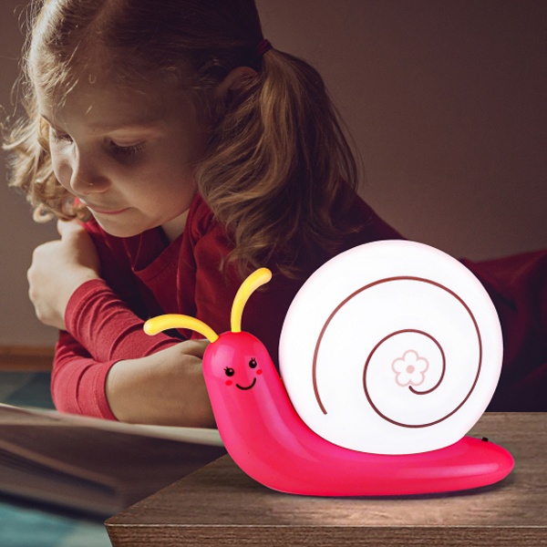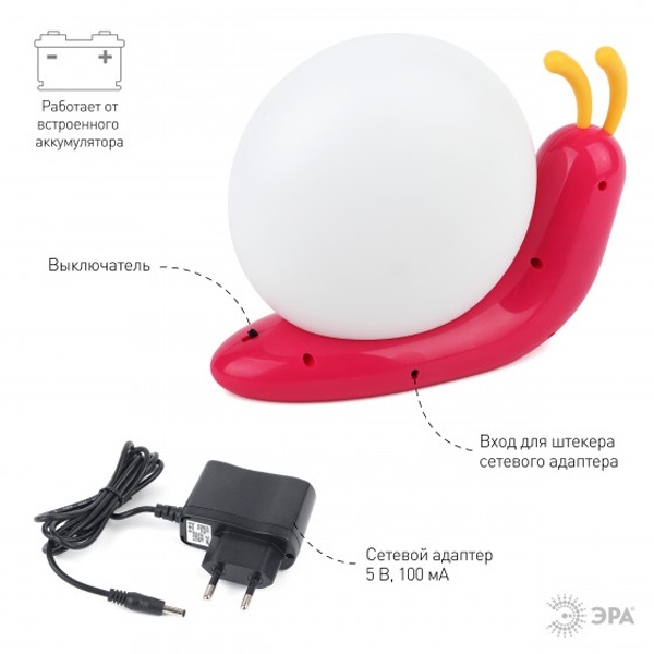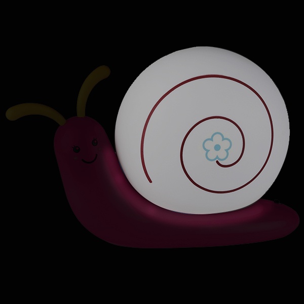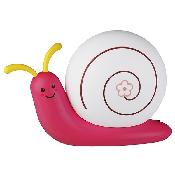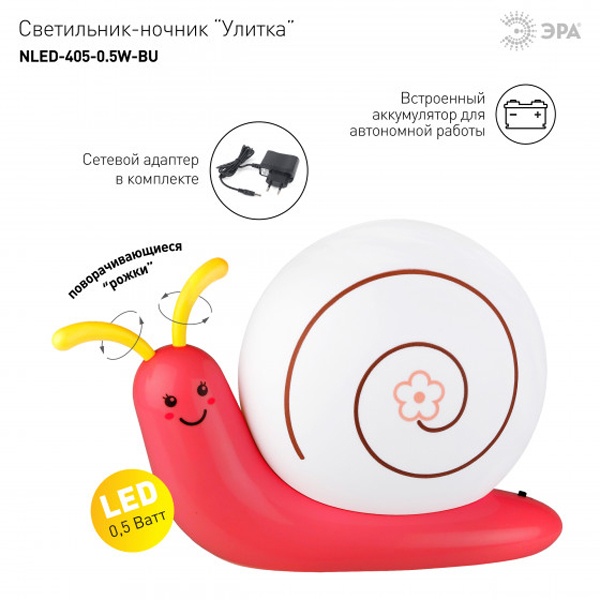 Светильник-ночник со светодиодами (LED) в качестве источников света. Встроенный аккумулятор для автономной работы. Сетевой адаптер в комплекте. Светильник работает во время зарядки от сети. Детский дизайн в виде улитки с поворачивающимися "рожками".