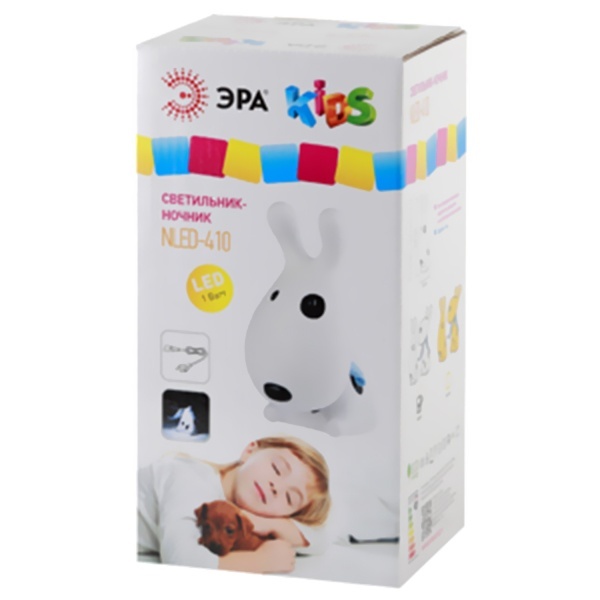 Встроенный аккумулятор для автономной работы. Съемный сетевой шнур длиной в комплекте. Светильник работает во время зарядки от сети. Два режима - максимальная яркость и приглушенный свет. Детский дизайн в виде собачки с мягким шарфиком на шее.