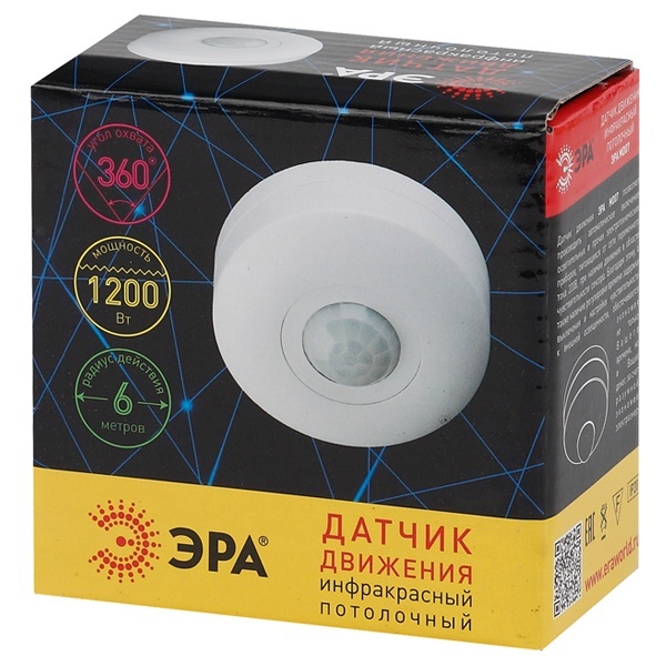 Главное преимущество данного потолочного датчика движения в максимально широком обзоре – 360 градусов. Устройство активно применяется для автоматического регулирования работы осветительных приборов на территории дачных участков, в производственных помещениях, гаражах, на лестничных клетках в подъездах многоэтажных домов. Датчики движения можно с удобством применять и в жилых помещениях. Данное устройство фиксирует движение в сенсорной зоне (6 метров) – и автоматически включает свет. Можно комфортно входить и перемещаться внутри помещений, не тратя время на поиски выключателя. Это особенно актуально, когда у пользователя заняты руки. Датчик движения обладает возможностью регулировки времени задержки выключения (от 10 секунд до 10 минут) и настройки чувствительности к внешнему освещению. Позволяет существенно экономить электроэнергию. Обладает повышенной мощностью – 1200 Вт.