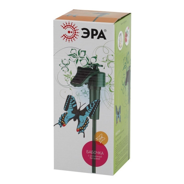 Современный грунтовый светильник на солнечной батарее торгового знака Era не имеет светящегося элемента, так как основной элемент конструкции – это яркая цветная бабочка на тонкой проволоке, эффектно "порхающая" вокруг основания. Устройство применяется для установки на улице и подходит для украшения ландшафтных композиций. Фигурка выполнена из пластика, ее высота – 21,5 см, ширина – 8,5 см. Аксессуар работает на солнечной батарее. Благодаря встроенному фотоэлементу, устройство автоматически заряжается под солнечным светом в дневное время, индикатор включается в темное время суток и выключается днем. Заряда солнечной батареи достаточно для непрерывного функционирования прибора на протяжении 8 часов. Садовый светильник рассчитан для применения на улице при любых погодных условиях и имеет степень защиты от влаги и пыли – IP65. Вес изделия – 0,2 кг. Гарантийный срок устройства – 6 месяцев. Срок службы – 2 года.