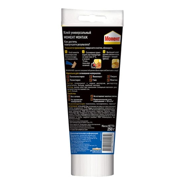 Области применения: - Надежно склеивает стиропор, дерево, металл, ПВХ, керамика, ДСП, МДФ, гипсокартон, пробка, полистирол, пенопласт, гипс и другие подобные материалы.