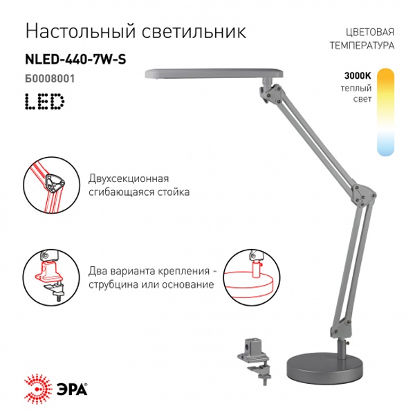 Серебрянный настольный светильник ЭРА NLED-440 на жесткой сгибающейся стойке с двумя вариантами установки(основание, струбцина), 20 светодиодов мощностью 7 Вт Б0008001