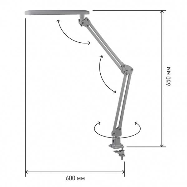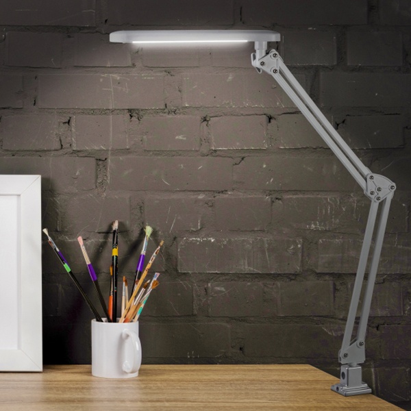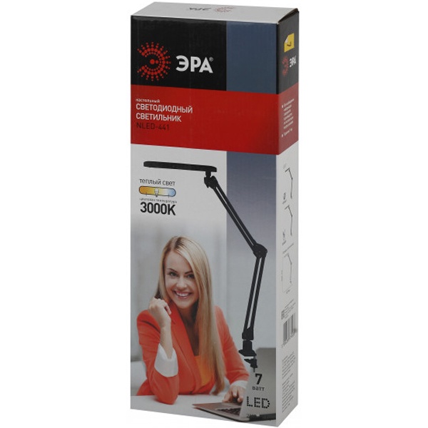 Настольный светильник ЭРА NLED-441 со светодиодами (LED) в качестве источников света. Выключатель на плафоне. Высота плафона регулируется двухсекционной сгибающейся стойкой. Удобное крепление на струбцину к любой плоской поверхности.