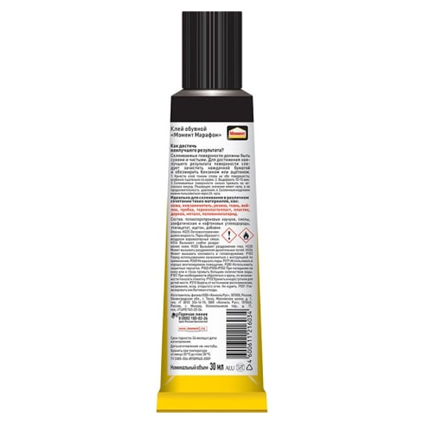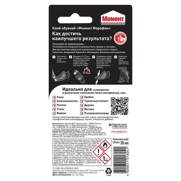 Момент Марафон является специальным обувным клеем, отлично подходящим для починки любых видов обуви из различных материалов в любых комбинациях.