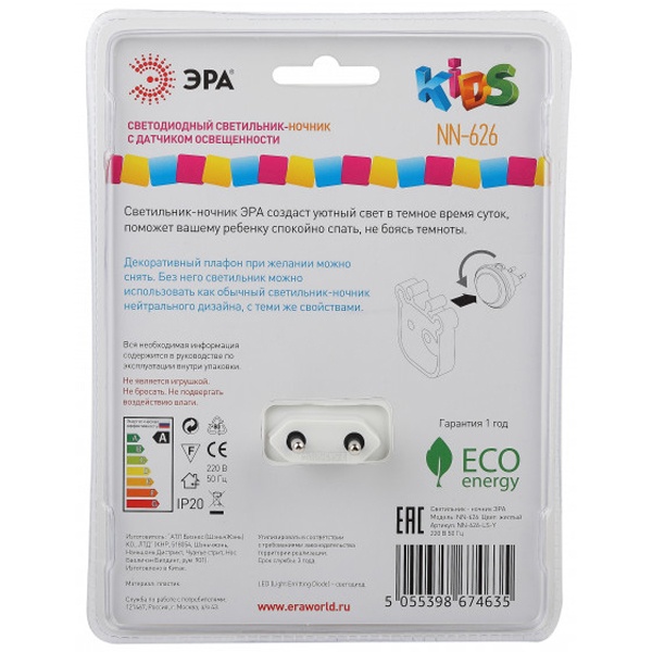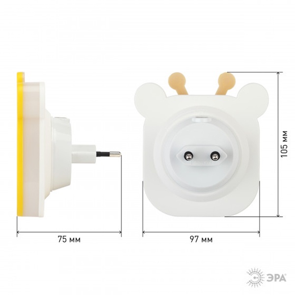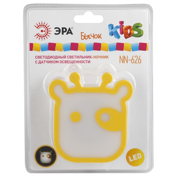 Ночник имеет съемную бикомпонентную насадку в виде цветной фигурки "Бычок". Можно использовать без насадки, так получается ночник в нейтральном дизайне (белый корпус). Среди множества вариантов ночников миниатюрные модели, вставляющиеся в розетку - одни из самых удобных. Максимально удобное устройство! Этот ночник включается автоматически, как только в помещении становится темно. И выключается, когда наступает утро или в комнате включают основное освещение. Просто воткните компактный ночник в розетку - все остальное он будет ответственно выполнять сам! Светодиодные ночники ЭРА отличаются мизерным энергопотреблением, которое будет незаметно в общем счете за электроэнергию. Современная LED-технология исключает пульсации света, освещение ровное и приглушенное - то, что нужно для комфортного сна или ночной подсветки. Упаковка позволяет проверить работу ночника не доставая его из блистера, нужно только включить его в розетку и прикрыть датчик освещенности рукой.