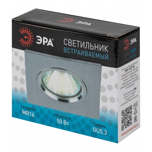 Встраиваемый точечный квадратный светильник Эра KL57 под лампы MR16 напряжением 12/220 Вольт, цвета серебро Б0017254