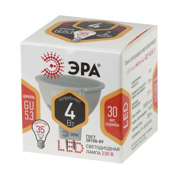 • Лампа светодиодная ЭРА LED MR16-4W-827-GU5.3 2700K 220V теплый свет