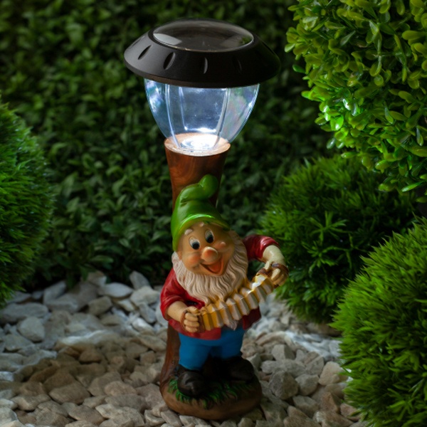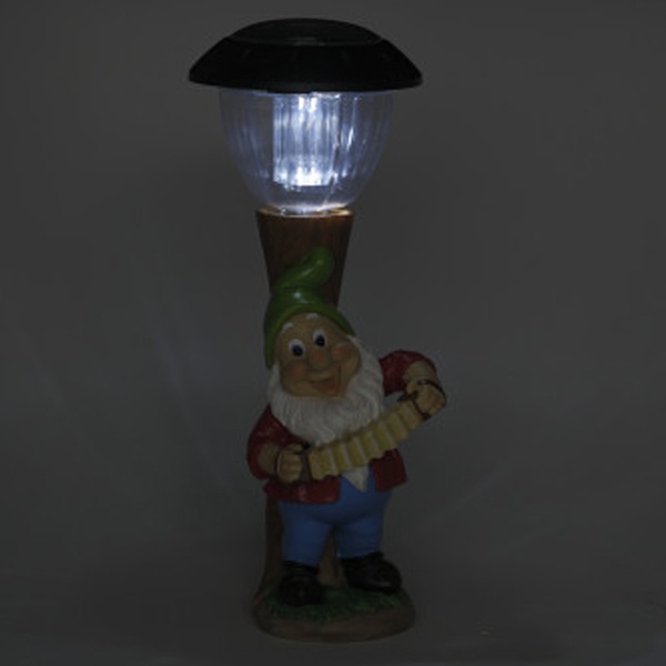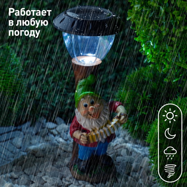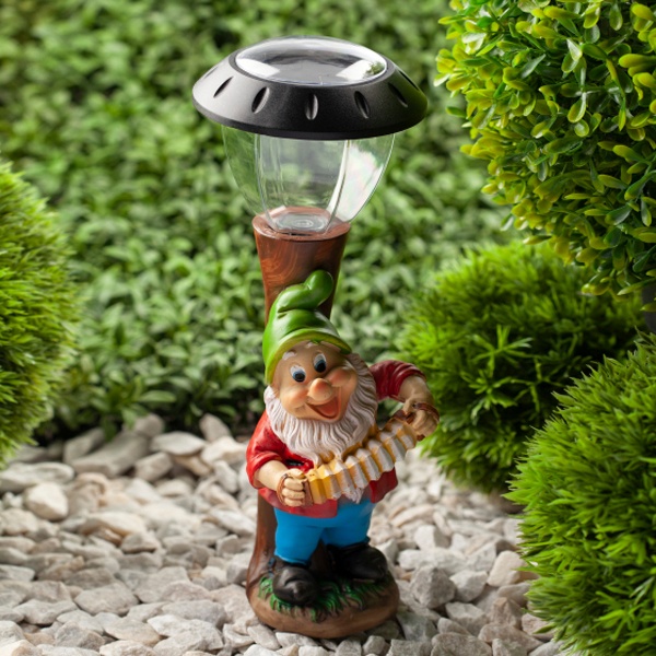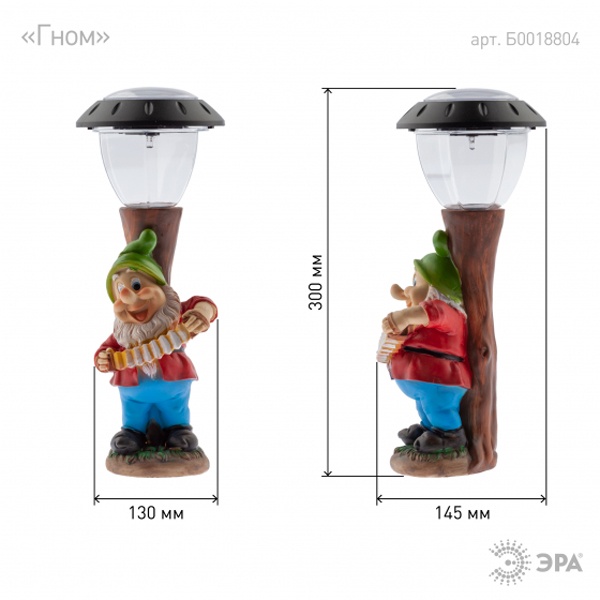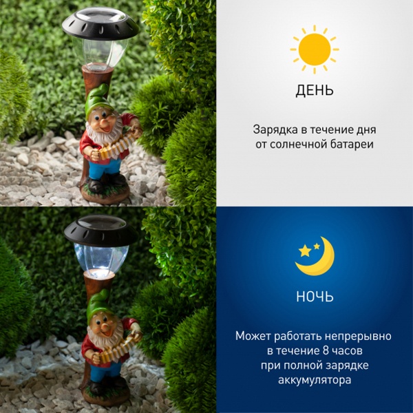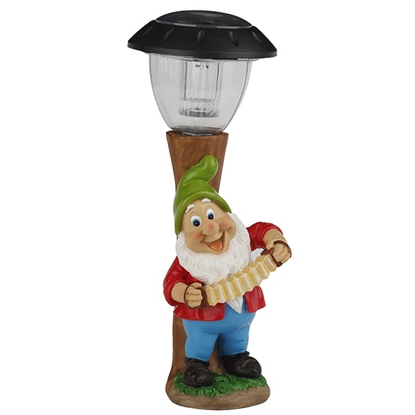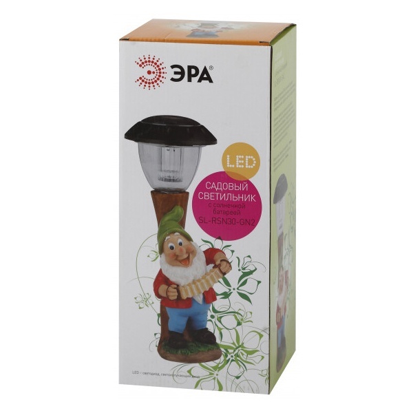 Современный наземный садовый светильник торговой марки ERA серии SL применяется для подсветки загородных домов и ландшафтного освещения. Светодиодный светильник с разноцветной фигуркой гнома с гармошкой в дневное время суток послужит прекрасным украшением сада, оживит пейзаж. Ночью он может быть декоративной подсветкой кустарника, газона, альпийской горки. Садово-парковый светильник работает от аккумулятора на солнечной батарее его мощность составляет 2 Ватта. Прозрачный плафон светильника отличается особой прочностью и долговечностью. Светодиодная лампа поставляется в комплекте. Материал основания декоративного светильника – полистоун. Габаритные размеры фонаря следующие: высота – 33,5 см, ширина – 14,5 см, длина – 14,5 см. Прочная конструкция и влагонепроницаемый корпус обеспечивают светильнику длительный срок службы. Степень защиты изделия – IP65, диапазон рабочих температур от -60 до +40 градусов Цельсия. Светильник рассчитан на применение на улице. Вес изделия – 0,6 кг. Гарантийный срок – 6 месяцев.