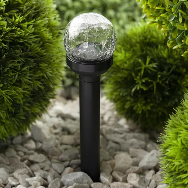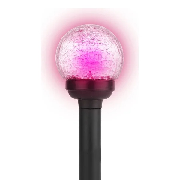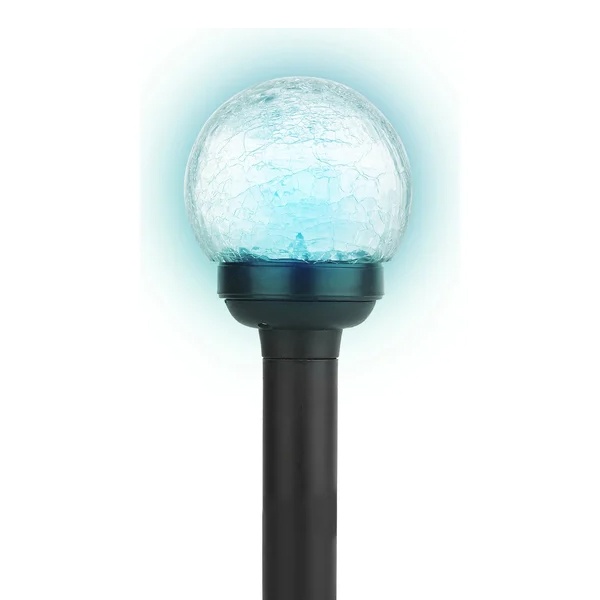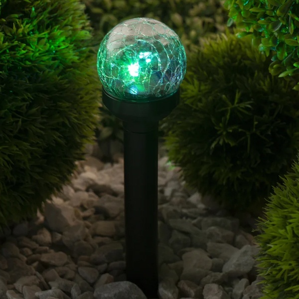 Светильник-втыкашка Кракле, в ПРОМОБОКСЕ. Диаметр стеклянного шарика 5,5 см. Основание - пластик. RGB светодиод. Поставляется в промоупаковке по 12 шт. Обращаем Ваше внимание, что перед использованием фигурки её необходимо включить и зарядить. Светильник заряжается в течение всего светового дня.