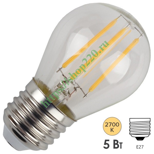 Светодиодная лампочка шарик с нитевидными светодиодами, мощностью 5 Ватт, с цоколем E27, тёплый свет Б0019008