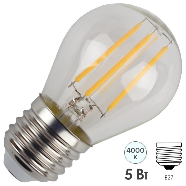 Светодиодная лампочка шарик с нитевидными светодиодами, мощностью 5 Ватт, с цоколем E27, нейтральный белый свет Б0019009..