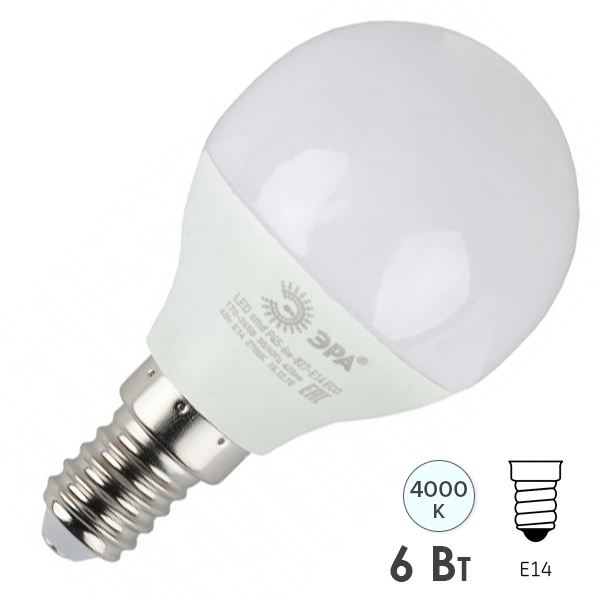 Светодиодная лампочка шарик ЭРА, мощностью 6 Ватт, с цоколем E14 (миньон), нейтральный белый свет Б0019077