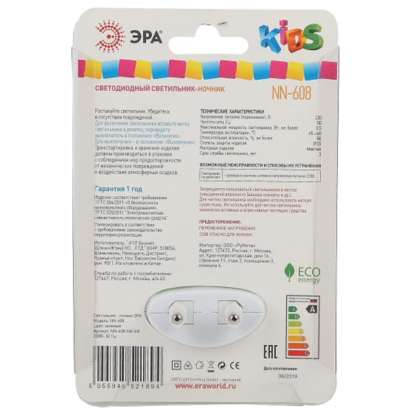 Характеристики по классификатору Etim по данным производителя:Светильник-ночник EC000075