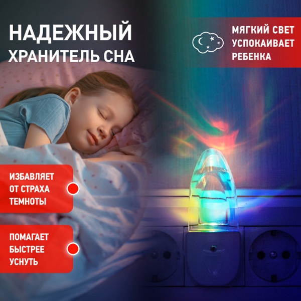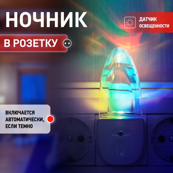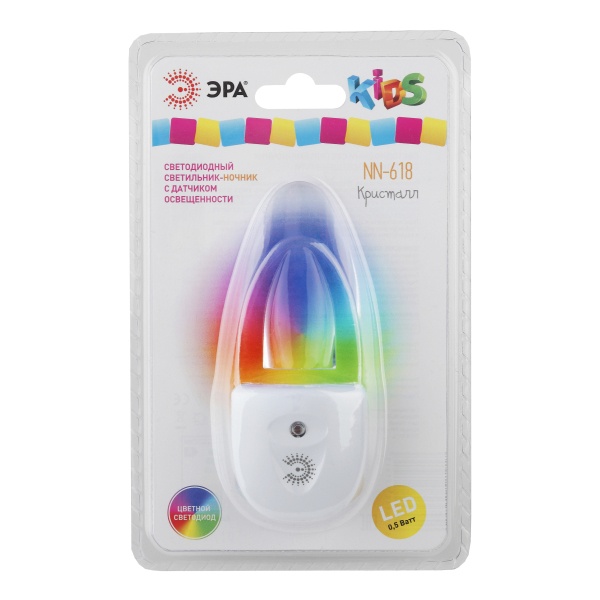 Ночник "Кристалл" со светодиодами (LED) в качестве источников света и встроенным датчиком освещенности. Включается автоматически, если вокруг темно, и так же сам гаснет с рассветом. Плавные переходы цветов очень красиво "играют" приятным неярким светом. Среди множества вариантов ночников миниатюрные модели, вставляющиеся в розетку - одни из самых удобных. Светодиодные ночники ЭРА успешно выполняют свою основную функцию - создают мягкий рассеянный свет. Они отличаются мизерным энергопотреблением, которое будет незаметно в общем счете за электроэнергию. При необходимости можно смело оставлять их включенными ночи напролет. Современная LED технология исключает пульсации света. Упаковка позволяет проверить работу ночника, не доставая его из блистера, нужно только включить его в розетку и прикрыть датчик освещенности рукой.