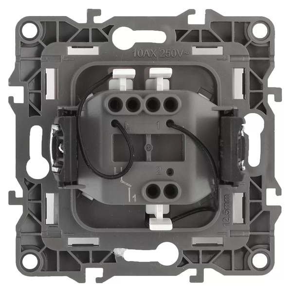 Механизм выключателя идет с накладкой клавиш из негорючего пластика. Фиксация в монтажную коробку на распорные лапки и винты. Для хорошего контакта питания используется самозажимной механизм. Суппорт с пазами для ровного объединения механизмов. Контактная группа выполнена из сплава меди и серебра.