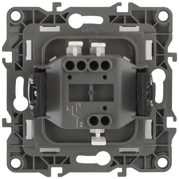 Механизм промежуточного выключателя для управления с трех или более мест идет с накладкой клавиш из негорючего пластика. Фиксация в монтажную коробку на распорные лапки и винты. Для хорошего контакта питания используется самозажимной механизм. Суппорт с пазами для ровного объединения механизмов. Контактная группа выполнена из сплава меди и серебра.