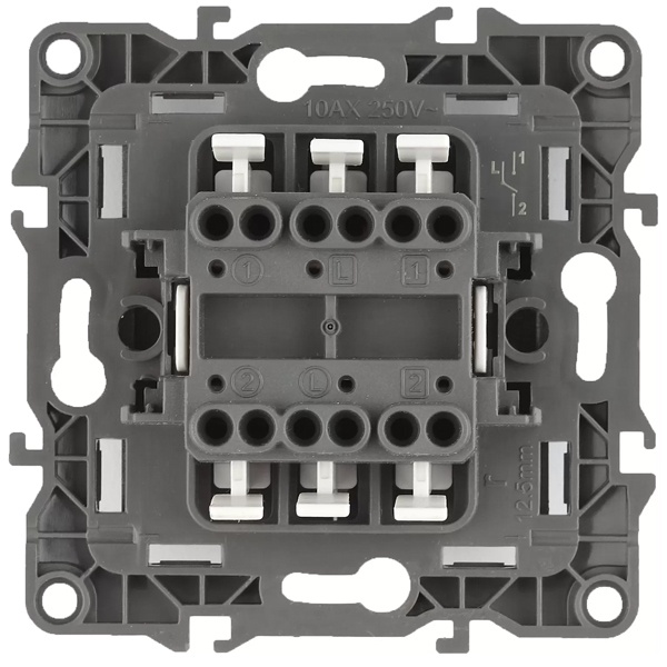 Выключатель идет с накладкой клавиш, изготовлены из негорючего пластика. Фиксация в монтажную коробку только на винты. Для хорошего контакта питания используется самозажимной механизм. Суппорт с пазами для ровного объединения механизмов. Контактная группа выполнена из сплава меди и серебра