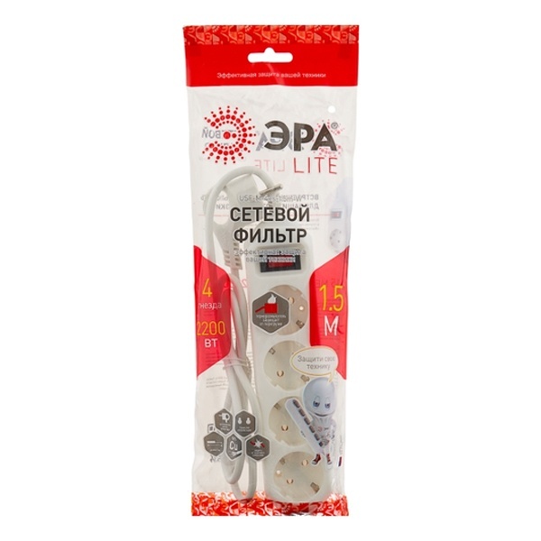 Сетевой фильтр ЭРА USF-M-4es-1.5m-W с защитой (термо) с заземлением с выключателем 4 розетки 1,5м 10А белый