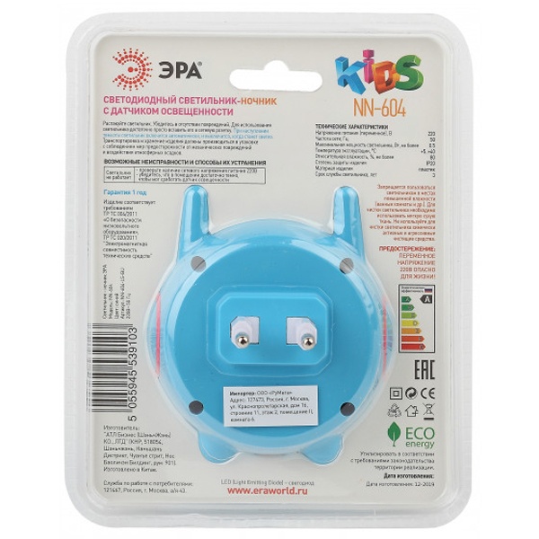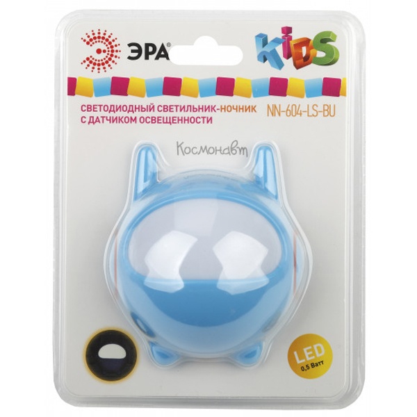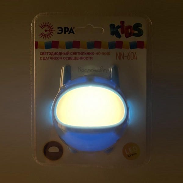 Ночник "Космотнавт" со светодиодами в качестве источников света и встроенным датчиком освещенности. Включается автоматически, если вокруг темно, и так же сам гаснет с рассветом. Среди множества вариантов ночников миниатюрные модели, вставляющиеся в розетку - одни из самых удобных. Светодиодные ночники ЭРА успешно выполняют свою основную функцию - создают мягкий рассеянный свет. Они отличаются мизерным энергопотреблением, которое будет незаметно в общем счете за электроэнергию. При необходимости можно смело оставлять их включенными ночи напролет. Современная LED технология исключает пульсации света, освещение ровное и приглушенное - то, что нужно для комфортного сна или ночной подсветки. Упаковка позволяет проверить работу ночника, не доставая его из блистера, нужно только включить его в розетку и прикрыть датчик освещенности рукой.