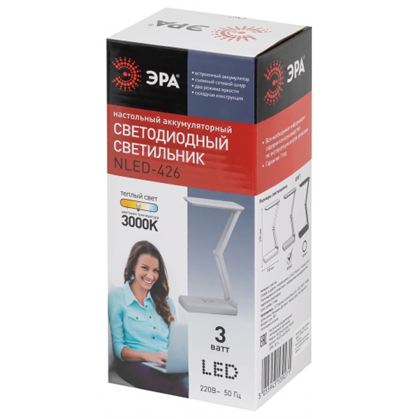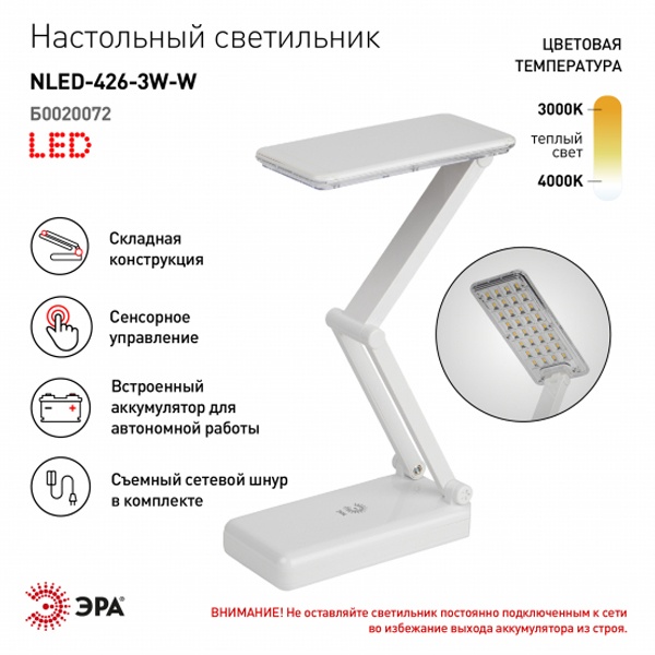 Настольный аккумуляторный светодиодный светильник ЭРА NLED-426 может работать автономно. Просто зарядите его и используйте там, где он нужен. Не важно, есть ли поблизости розетка вам будет комфортно! Можно выбрать максимальную яркость или приглушенный свет. Часто этот светильник используют в качестве бытового фонарика. У светильника съемный сетевой шнур в комплекте и складная конструкция для легкости его перевозки и компактного хранения.ВНИМАНИЕ! Не оставляйте светильник постоянно подключенным к сети во избежание выхода аккумулятора из строя. Время зарядки - не более 14 ч. После полной зарядки используйте светильник в автономном режиме не менее 2 часов! Если аккумулятор полностью разряжен, светильник не включается, его необходимо заряжать не менее 14 часов в выключенном состоянии.