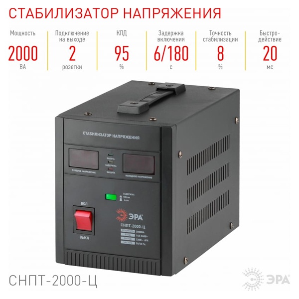 Автоматический однофазный стабилизатор напряжения ЭРА СНПТ-2000-Ц, полная мощность 2000 ВА, с двумя розетками, переносного типа, цифровой индикатор Б0020160