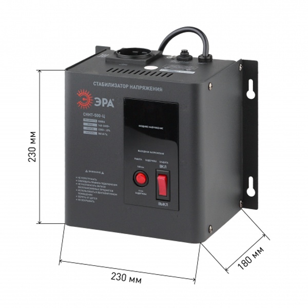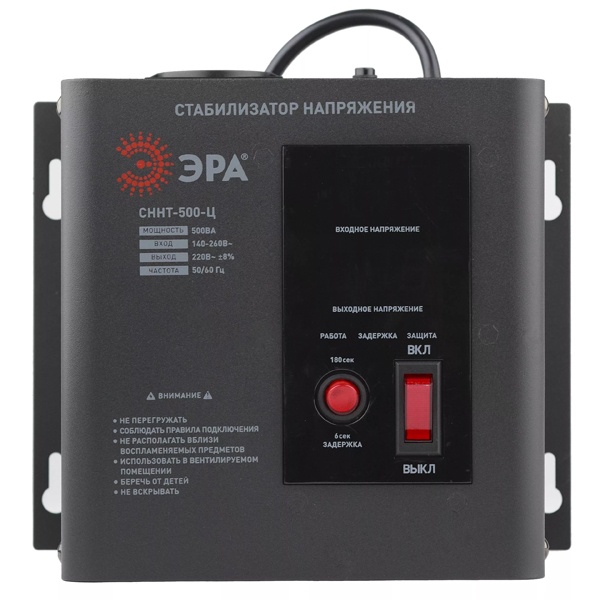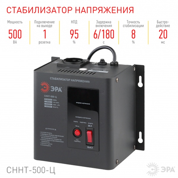 Автоматический однофазный стабилизатор напряжения ЭРА СННТ-500-Ц, полная мощность 500 ВА, с одной розеткой, настенного типа, цифровой индикатор Б0020165