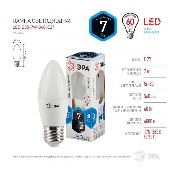 Б0020540 Лампа светодиодная свеча ЭРА LED B35 7W 840 4000K 220V E27 холодный свет