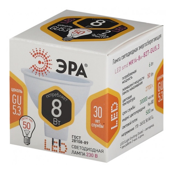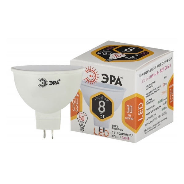• Лампа светодиодная ЭРА LED MR16-8W-827-GU5.3 2700K 220V теплый свет